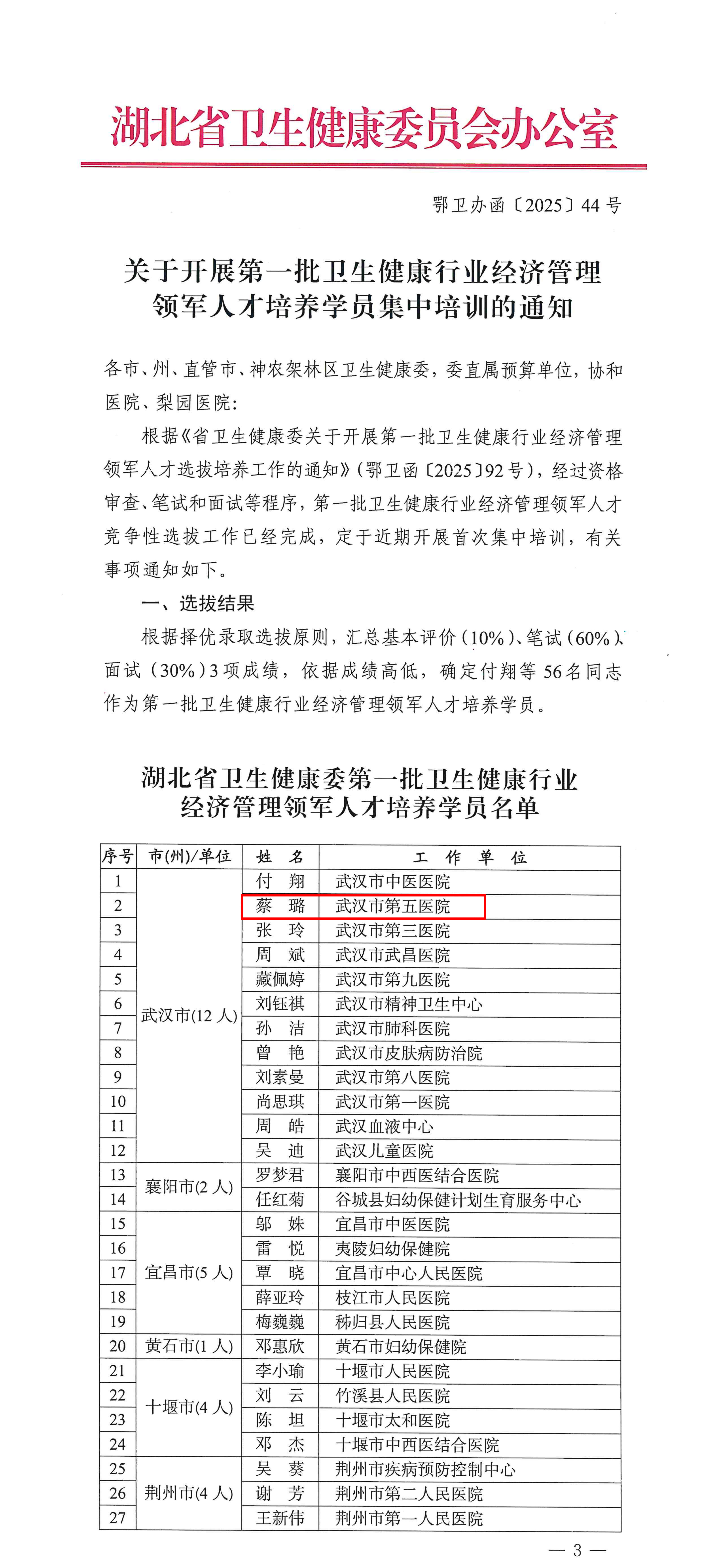 9月28日,国家卫生健康委发布第六批卫生健康行业经济管理领军人才培养学员名单,我院财务科蔡璐同志成功入选。标志着医院在卫生经济管理领域人才建设方面再次取得重要进展。